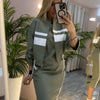 DETTAGLI A RIGHE SPORTIVE - Le dinamiche righe bianche su giacca e gonna aggiungono un tocco moderno e sportivo-chic all'insieme. Questo dettaglio alla moda impreziosisce il design, offrendo un'estetica fresca ed energica che si distingue.